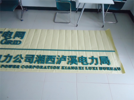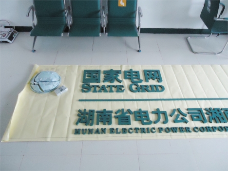 電業(yè)局會議室安裝案例:按國家電網(wǎng)VI標準將標志做成球形分塊模具;用樹脂材料注入模具摻入玻璃纖維,前后四層;毛胚標志開模后進行粗磨修形,精磨后進行底漆、面漆4遍的打磨噴白色漆高溫爐烤后,單塊內(nèi)包裝,整體標志獨立裝箱;中間內(nèi)圓與圈外中英文分開,標志周邊小字、大字和英文字都用PVC結皮板雕刻再噴白色漆,門楣底板采用國網(wǎng)綠鋁塑板或貼國網(wǎng)綠3M膜;具有高強度,耐高溫,不變形,使用年限長等特點。