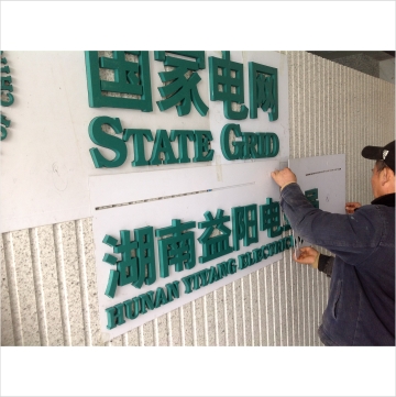 4、中間內(nèi)圓與圈外中英文分開,標(biāo)志周邊小字、大字和英文字都用PVC結(jié)皮板雕刻再噴國網(wǎng)綠漆,底板采用鋁塑板。