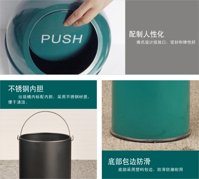 3、垃圾桶內(nèi)標(biāo)配不銹鋼內(nèi)膽,邊緣采用了不銹鋼包邊,不僅提高了箱體美觀度而且在使用過程中不易出現(xiàn)表面刮痕,同時(shí)也便于清理。