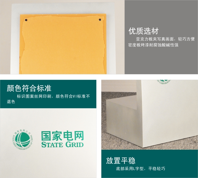 特點:密度板烤漆,絲印標志及高精度寫真不易退色,防腐蝕酸堿;亞克力用廣告釘安裝在密度板輕巧方便。
