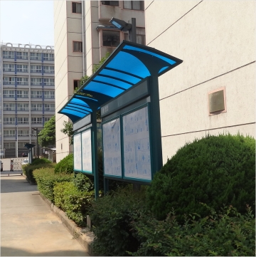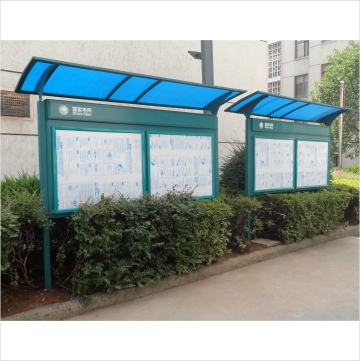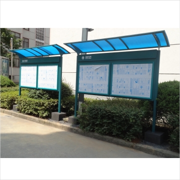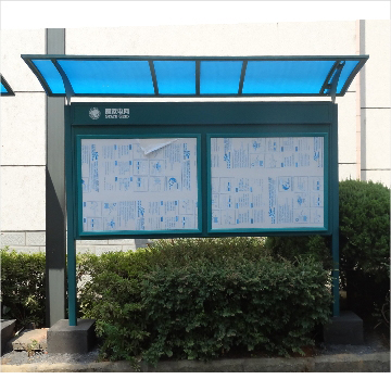 1、宣傳欄頂部采用鋼架固定綠色陽光板,這樣固定起到牢固作用。