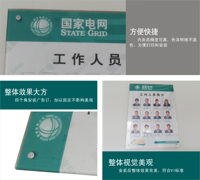 國家電網制度牌,亞克力裱高精度寫真,堅韌、透明、不易碎、不變色;產品具有極佳的耐候性和表面光澤,以及較好的高溫性能,能達到很好的展示效果。通產適用于營業廳、辦公樓等。