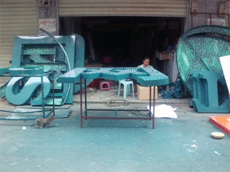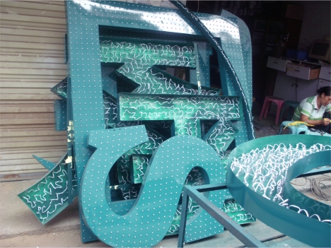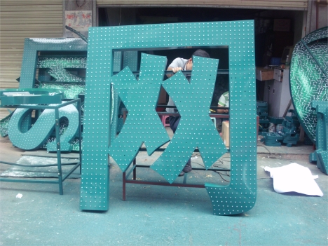 樓頂發光標志安裝案例:按國家電網VI標準將標志模板先將板材沖孔再裁型,在內部安裝LED燈源,達成發光效果,尺寸可根據客戶要求定做。