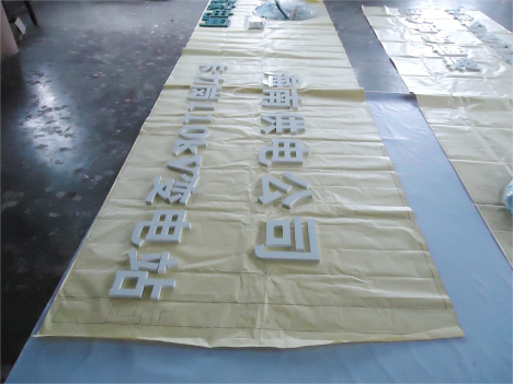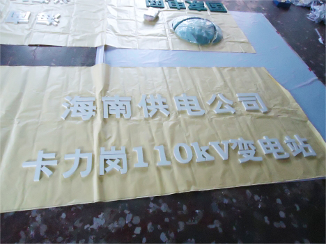 變電站地標案例圖:按國家電網VI標準將標志做成球形分塊模具;用樹脂材料注入模具摻入玻璃纖維,前后四層;具有高強度,耐高溫,不變形,使用年限長等特點;毛胚標志開模后進行粗磨修形,精磨后進行底漆、面漆4遍的打磨噴白色漆高溫爐烤后,單塊內包裝,整體標志獨立裝箱;中間內圓與圈外中英文分開,標志周邊小字、大字和英文字都用PVC結皮板雕刻再噴國網綠漆,底板采用鋁塑板。